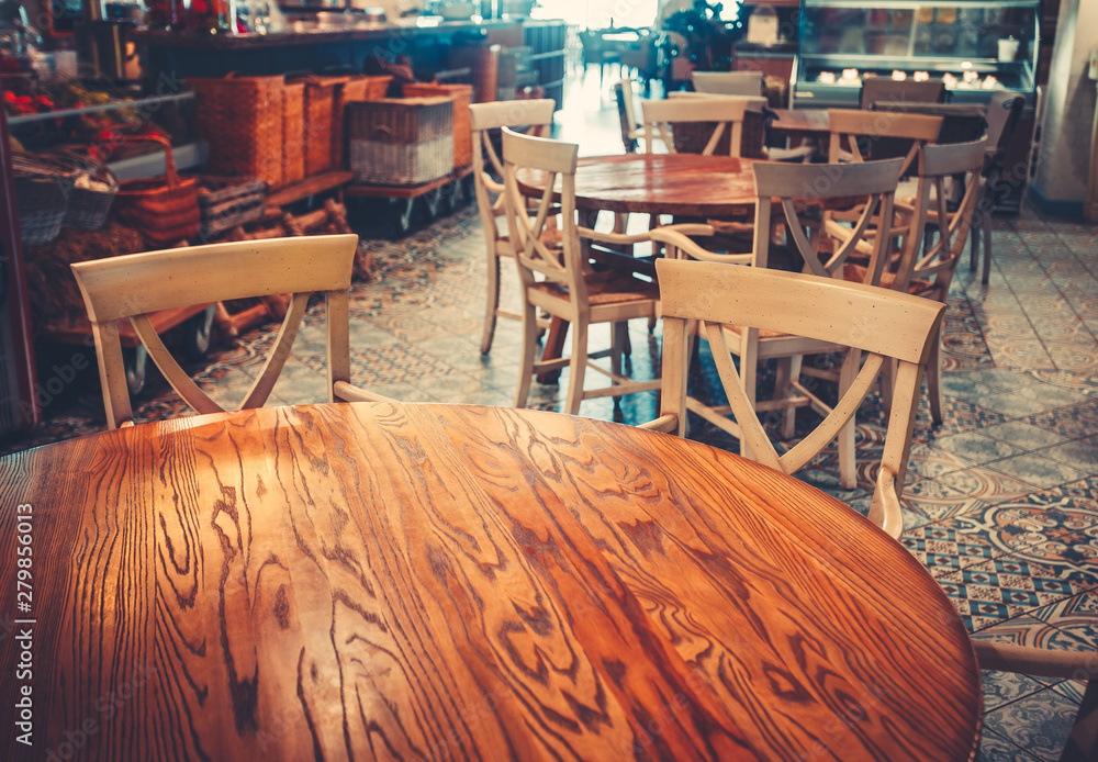 Modern And Simple Cafe Interior With Wooden Classical Furniture Wooden Floor Round Tables And Chairs Concept Of Eating Outside And Communication Food Concept Bright Orange Color Instagram Filter Stock Photo